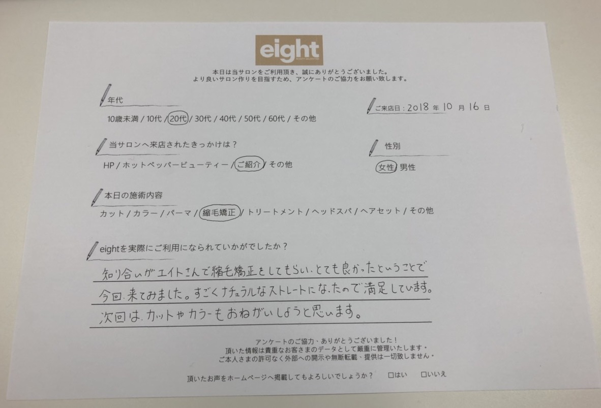 - 知り合いがエイトさんで縮毛矯正をしてもらい、とても良かったということで
